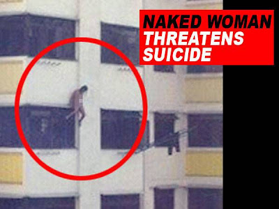 A naked woman attempted suicide in Toa Payoh yesterday. Sitting in the nude outside a window, she attracted more than 100 shocked spectators who came to gawk at her.